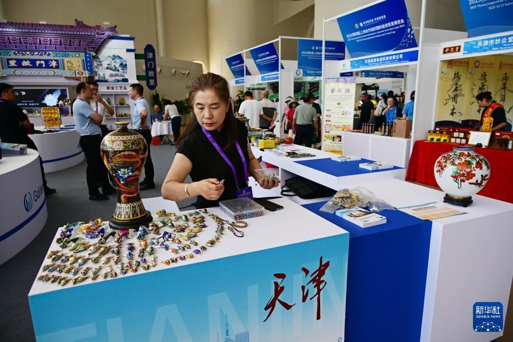 7月18日,一名來自天津的參展商在2025上海合作組織國(guó)際投資貿(mào)易博覽會(huì)上布置展臺(tái)。