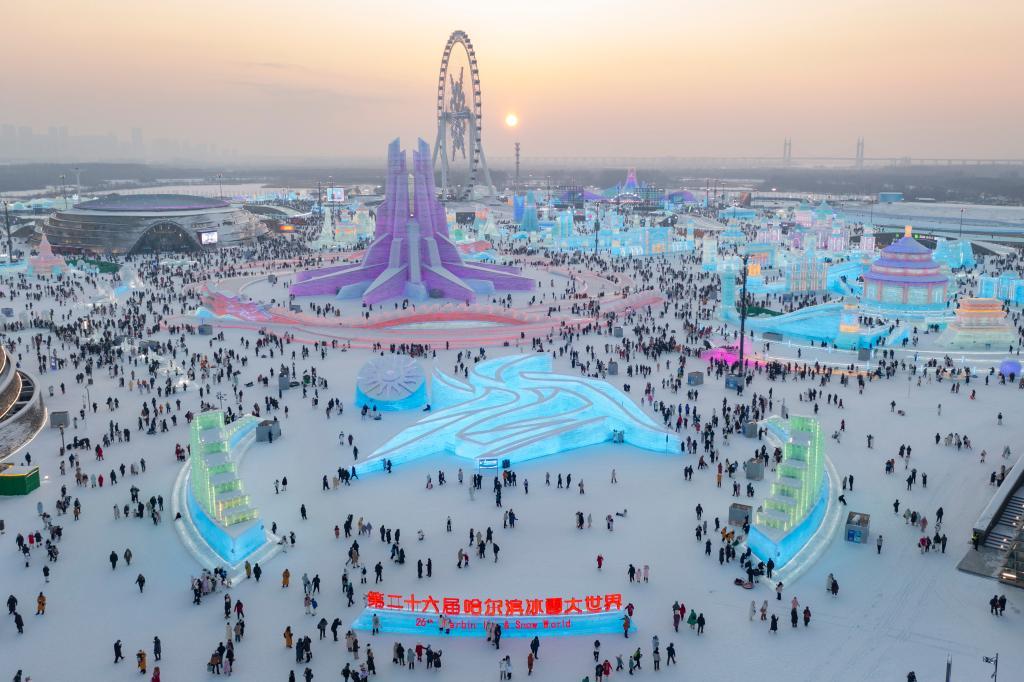 游客在哈爾濱冰雪大世界園區(qū)內(nèi)游玩(無人機(jī)照片)。新華社記者謝劍飛 攝