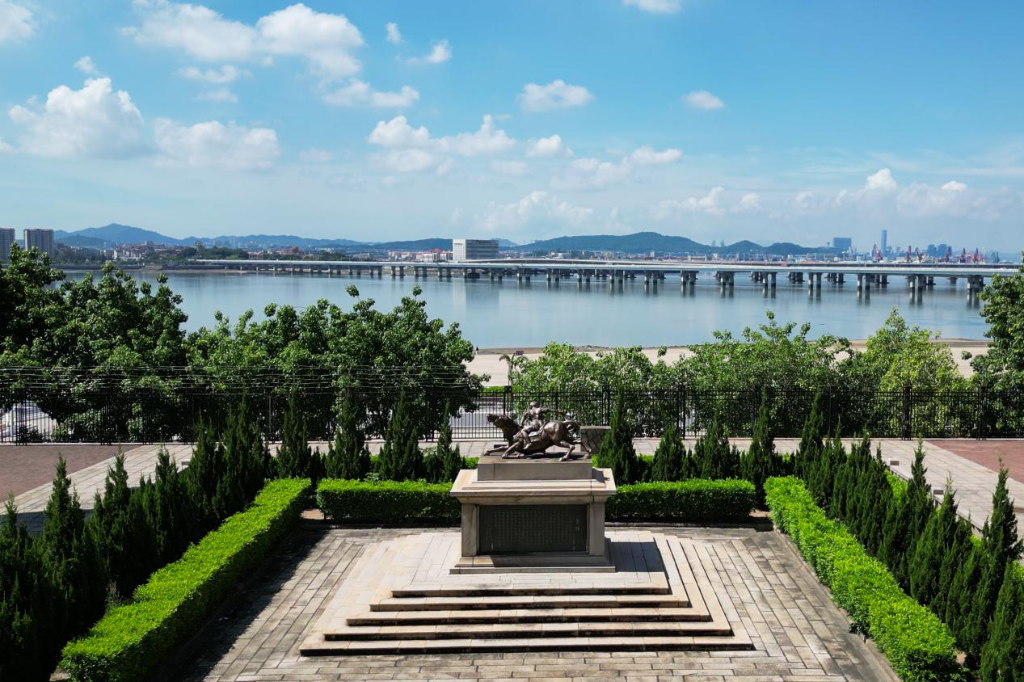 ↑福建省廈門集美中學(xué)李林園內(nèi),面海而立的李林雕像。(無人機照片)鐘煒俊攝