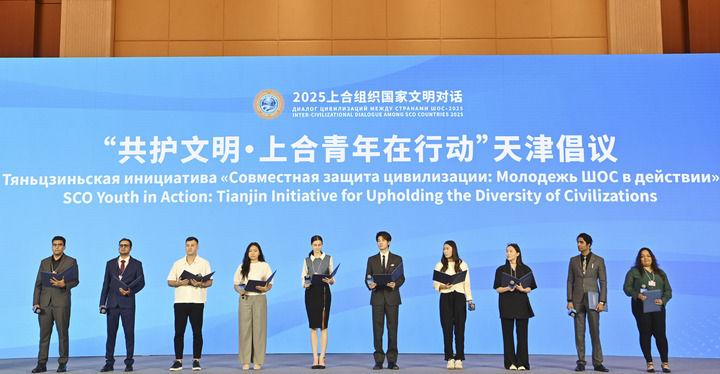 這是在2025上合組織國家文明對話現(xiàn)場拍攝的“共護(hù)文明·上合青年在行動”天津倡議發(fā)布環(huán)節(jié)(2025年7月23日攝)。新華社記者 李然 攝