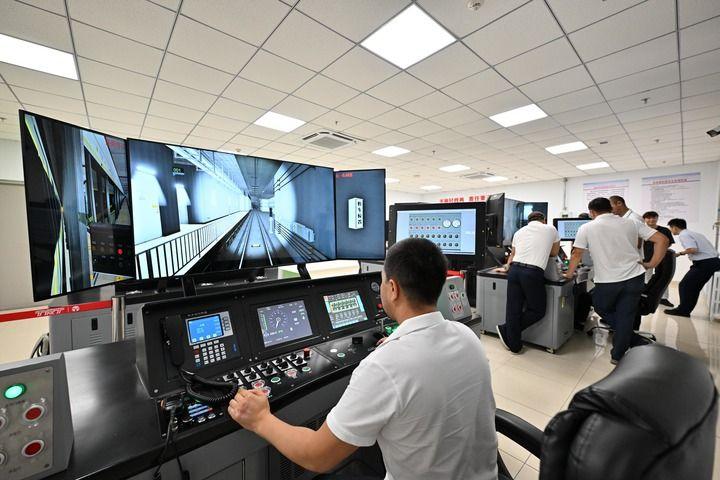 哈薩克斯坦阿斯塔納首條輕軌列車的駕駛員學員在天津地鐵十號線車輛維修基地進行地鐵模擬駕駛培訓。(新華每日電訊記者孫凡越攝)