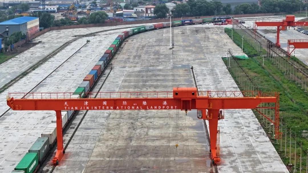 7月1日,列車在天津國(guó)際陸港準(zhǔn)備出發(fā)(無人機(jī)照片)。新華社記者 李然 攝