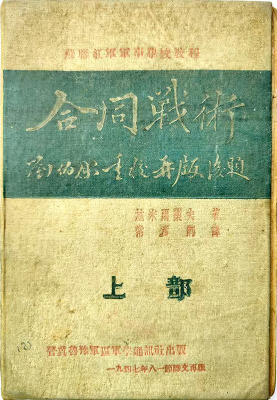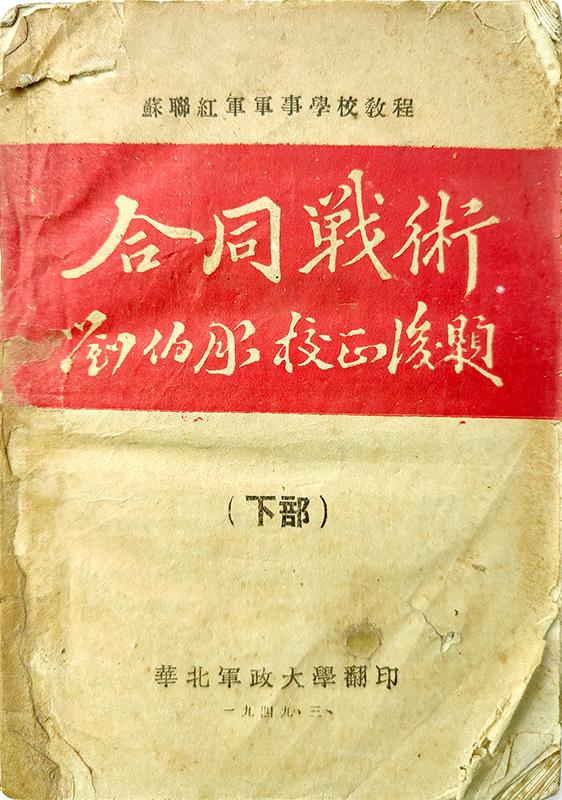 《合同戰(zhàn)術(shù)》,蘇聯(lián)紅軍軍事學校教程,系統(tǒng)論述多兵種戰(zhàn)斗特性和協(xié)同作戰(zhàn),是劉伯承等人著眼于人民軍隊未來戰(zhàn)術(shù)的發(fā)展,在戰(zhàn)斗間隙精心翻譯出來的。