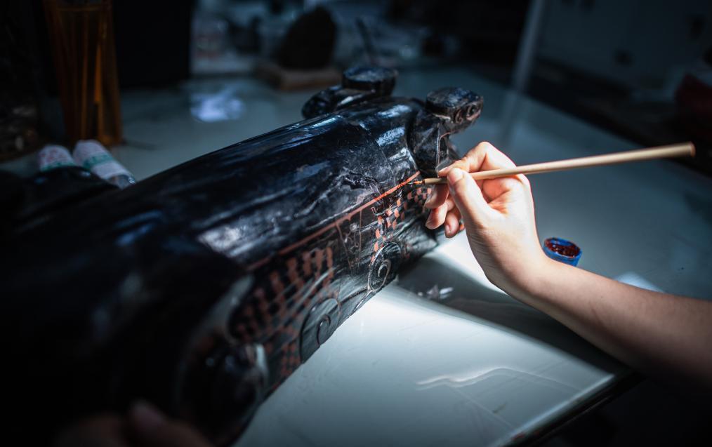 在荊州文物保護(hù)中心,文物修復(fù)人員修復(fù)一件戰(zhàn)國(guó)獸形酒具盒。新華社記者肖藝九 攝