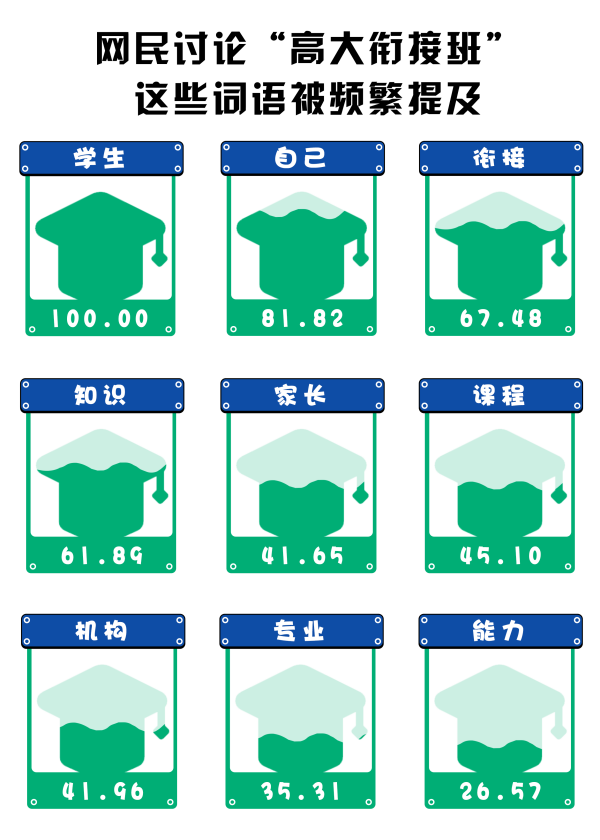(數(shù)據(jù)來源:選取知乎話題“培訓(xùn)機構(gòu)推出‘高大銜接班’,為大一新生補習(xí)大學(xué)知識,暑假補課真能‘贏在大學(xué)起跑線’嗎?”下的172個回答,做分詞及歸一化處理,進行分詞后將熱度最高的詞語規(guī)定為100)