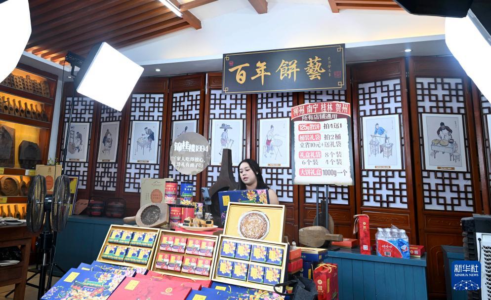 9月22日,在廣西柳州市一家百年糕點企業(yè)里,主播在車間外直播銷售月餅。