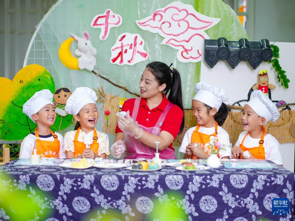 9月25日,在江蘇省泰州市姜堰區(qū)第三實驗幼兒園,小朋友們在老師的指導下學習做月餅。