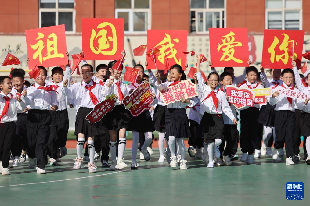 9月25日,在山東省臨沂市沂南縣,第三實(shí)驗(yàn)小學(xué)的小學(xué)生們參加“祝福祖國”活動。