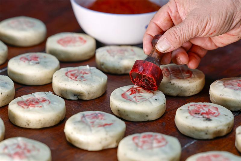 制餅師傅在“徽式麻仁月餅”上蓋印。新華網發(fā)(施亞磊 攝)