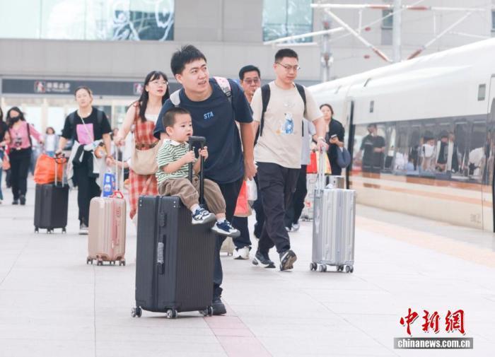 10月1日,國(guó)慶中秋假期首日,家長(zhǎng)帶著孩子在北京北站乘車。當(dāng)日,中國(guó)鐵路迎來(lái)國(guó)慶中秋假期客流最高峰,預(yù)計(jì)發(fā)送旅客2300萬(wàn)人次,計(jì)劃加開旅客列車2106列。中新社記者賈天勇攝