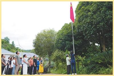 拿著鋤頭出工的鄉(xiāng)親,晨起的學生,專程過來的男女老少……30多名村民圍在旗桿邊,自覺立正、唱國歌、行注目禮,用堅定的眼神注視著飄揚的紅旗。山風與鳥鳴,為齊唱的國歌聲伴奏。