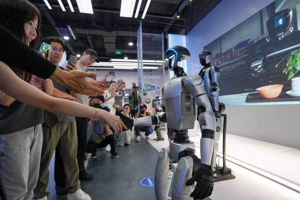 在位于北京經(jīng)開(kāi)區(qū)的全球首個(gè)具身智能機(jī)器人4S店(ROBOT MALL)內(nèi),觀眾在與一款人形機(jī)器人握手(2025年8月6日攝)。新華社記者 鞠煥宗 攝