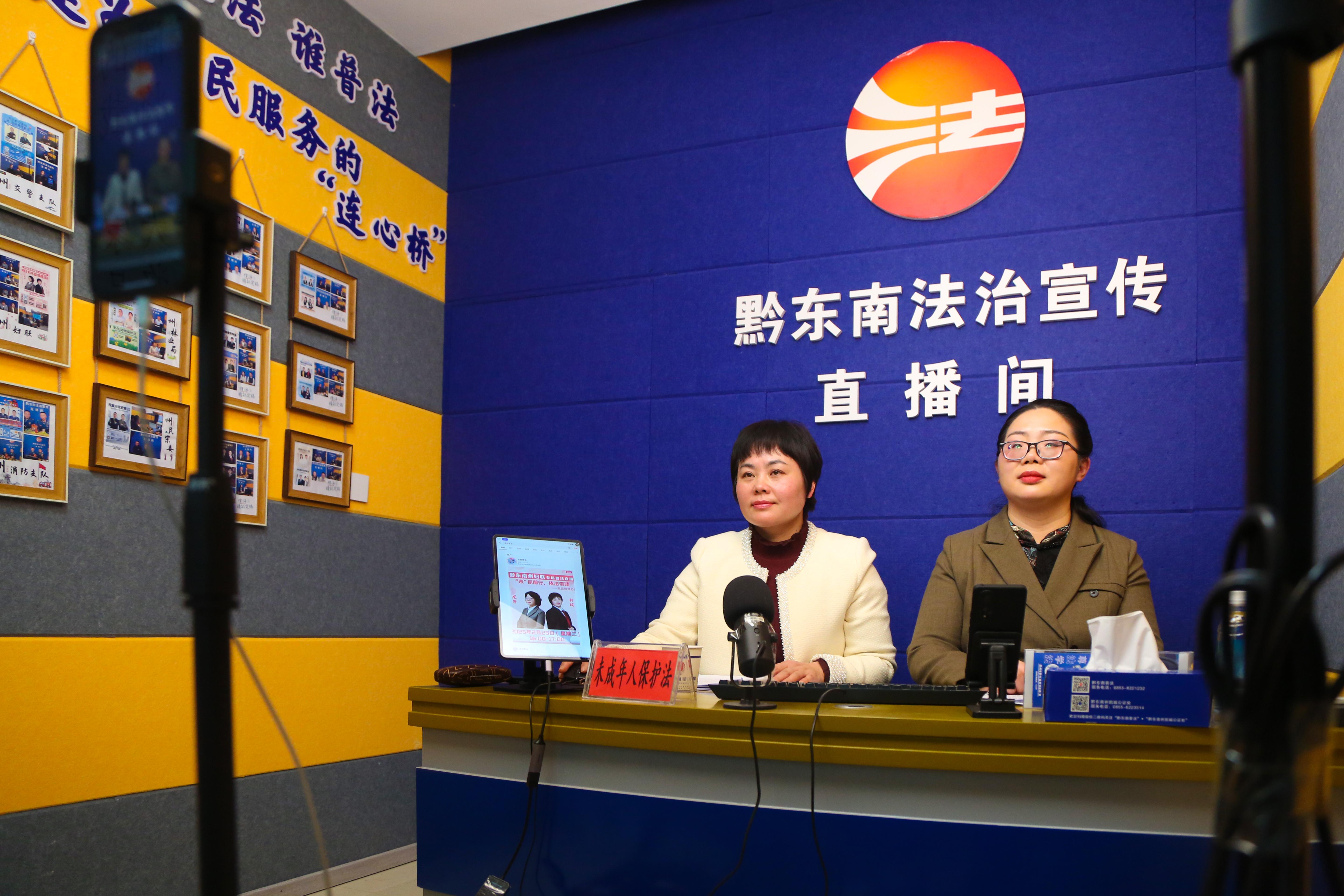 圖為2月25日,法治副校長團隊成員到黔東南法治宣傳直播間向網(wǎng)民普及未成年人保護法。