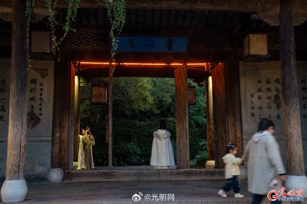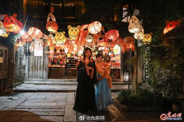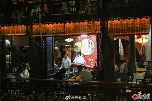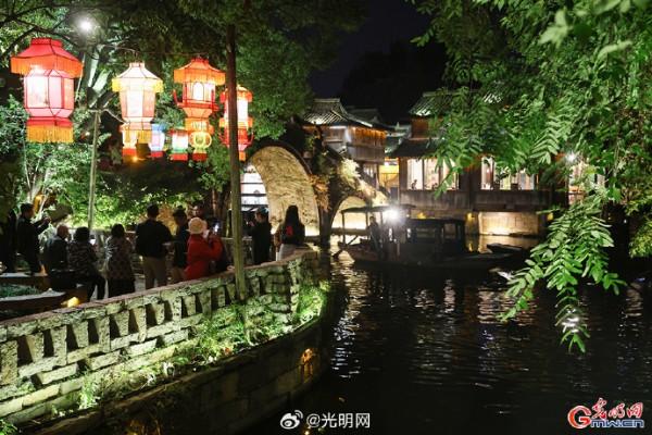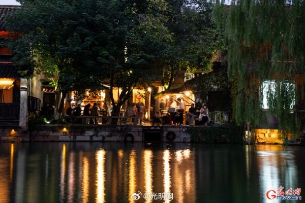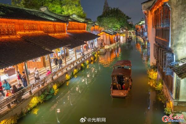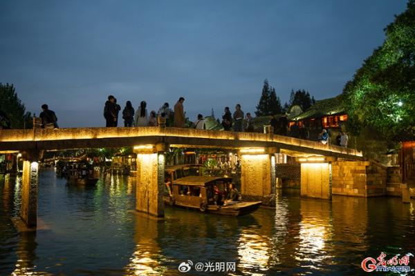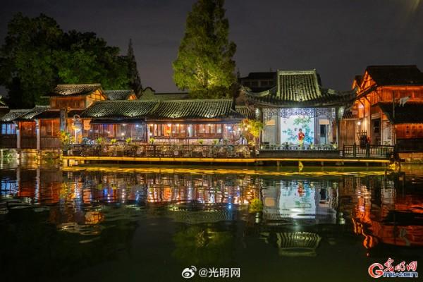 隨著夜幕降臨,河道兩岸燈光點(diǎn)綴,烏篷船緩緩劃過,水面映射出絢麗色彩。當(dāng)暮色浸染白墻黛瓦,烏鎮(zhèn)從素簡水墨畫蛻變?yōu)榱鞴庖绮实臄?shù)字夢境。