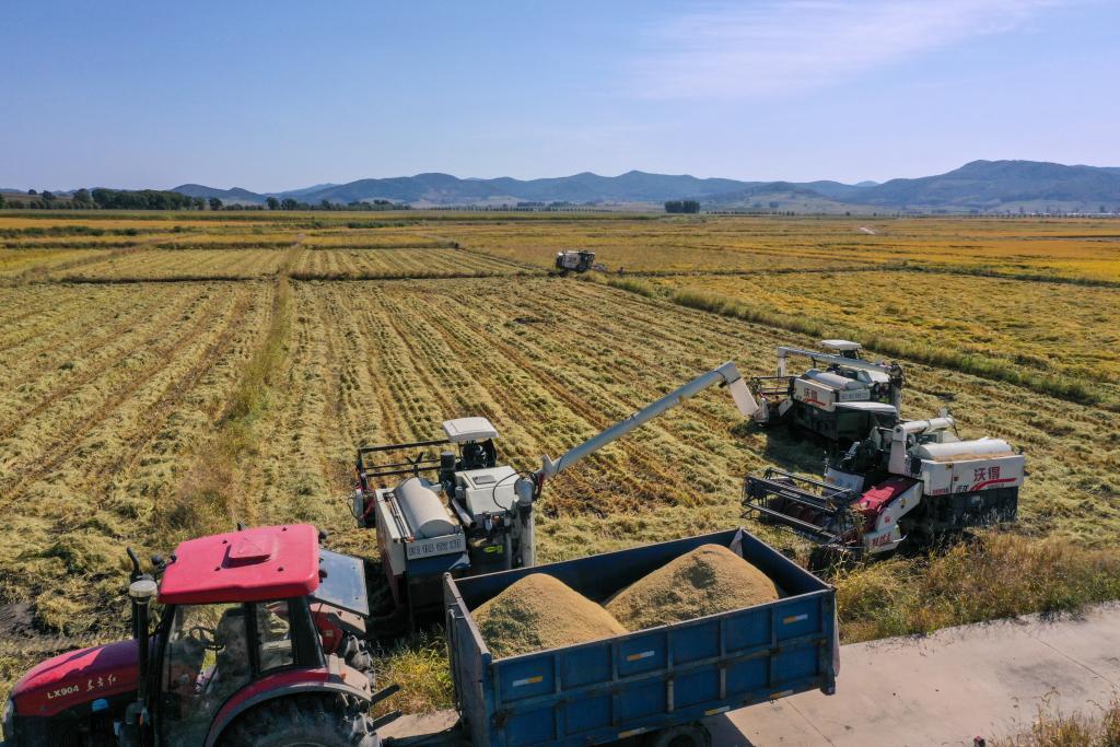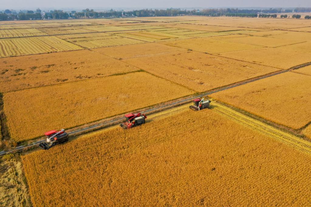 10月14日,在吉林省公主嶺市,吉林省米兜種植農(nóng)民專(zhuān)業(yè)合作社進(jìn)行機(jī)械化收割水稻作業(yè)展示(無(wú)人機(jī)照片)。新華社記者 張楠 攝