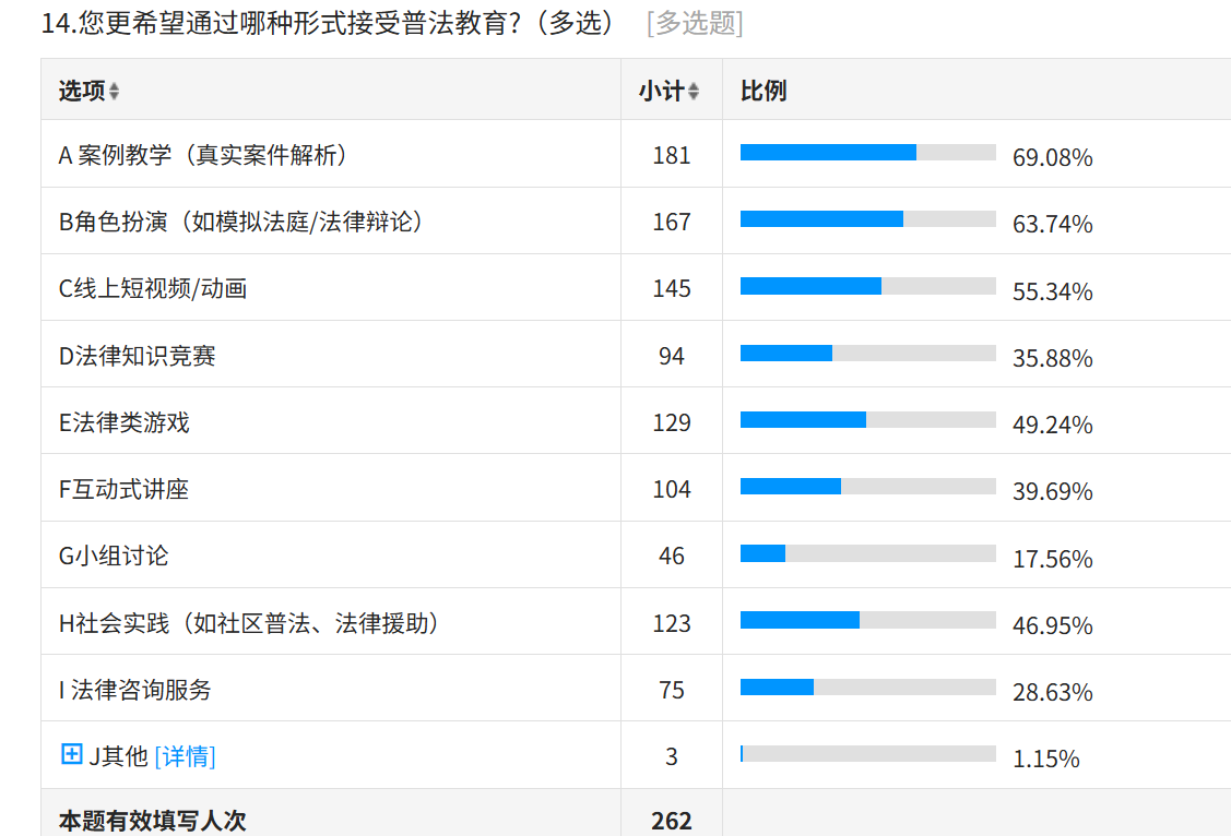 其次,高校普法實踐模式覆蓋面低。大概百分之四十多的學生反饋缺乏普法實踐,渴望在實踐中體驗和運用法律知識。當前高校普法教育有的采取了模擬法庭、法律診所、實地調研等實踐教學方式,但局限于資源及其他原因,存在形式化、一次性的問題,沒有真正達到提高學生法律實踐能力的目的。