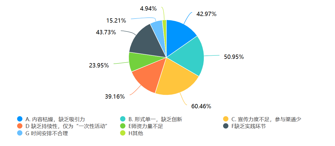 盡管高校普法教育在工作體系的建立、普法方法的探索、普法實效等方面取得很大的成績,但目前仍存在一些不足之處。筆者進行的高校大學生普法教育調查問卷活動中,針對“你認為當前高校普法教育存在哪些問題?”的多選題,調查問卷結果如圖二所示,總結起來存在下列幾個方面的問題及原因:
