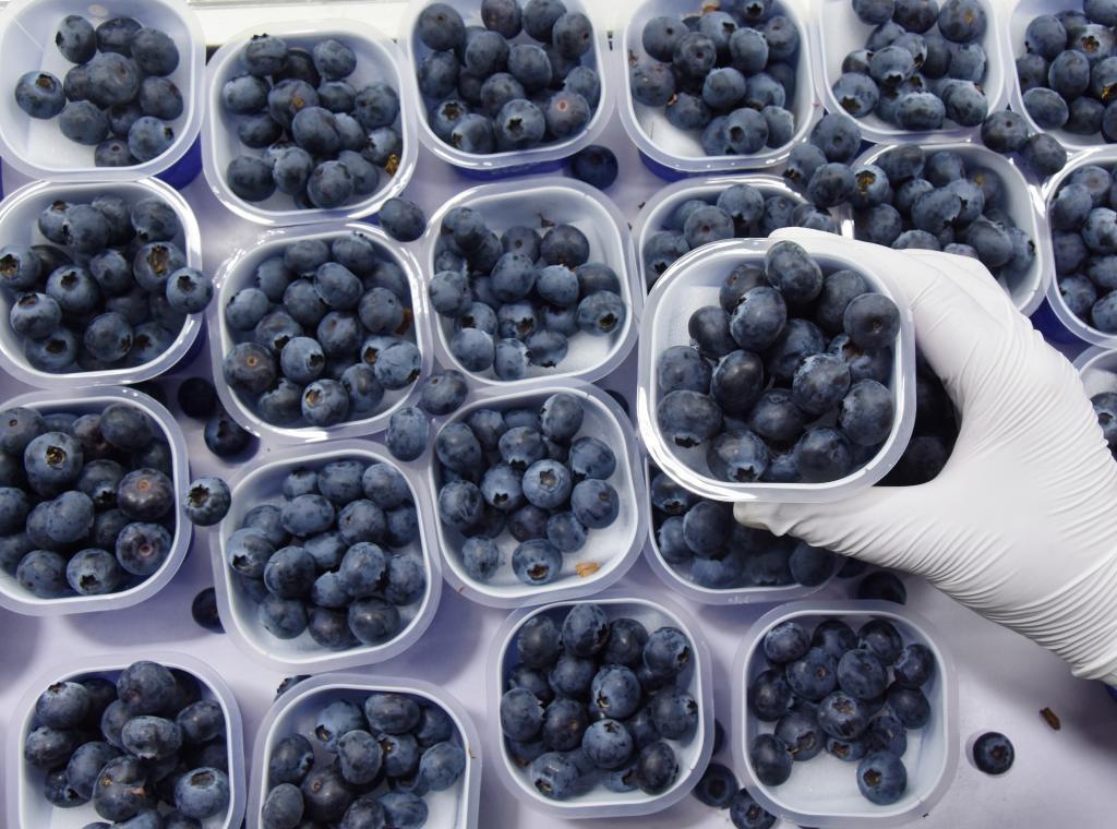 農戶在云南省蒙自市草壩鎮(zhèn)繽紛農業(yè)示范基地的冷藏庫里分揀藍莓。新華社發(fā)(薛瑩瑩 攝)