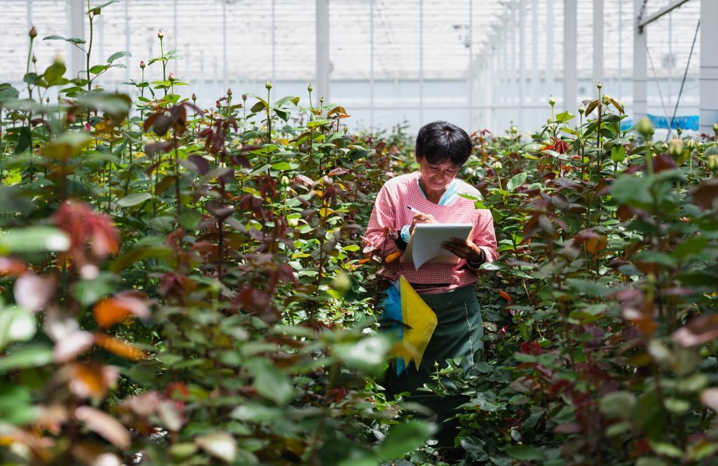 工作人員在麗江現代花卉產業(yè)園內記錄鮮花生長狀況。新華社記者王冠森 攝