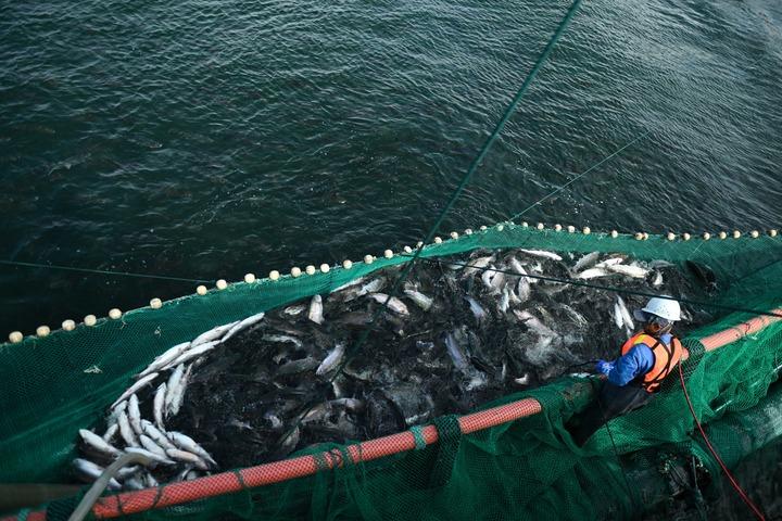 51歲的馮庭貴住在青海省海南藏族自治州共和縣龍羊峽鎮(zhèn),是龍洋知鮮(青海)股份有限公司捕撈隊(duì)隊(duì)長(zhǎng)。“傳統(tǒng)吊網(wǎng)捕撈會(huì)讓虹鱒魚產(chǎn)生更多肌酸,讓虹鱒魚的口感大打折扣。我們現(xiàn)在用吸魚泵連魚帶水直接送入車間,保證了魚的肉質(zhì)鮮嫩?!瘪T庭貴說。