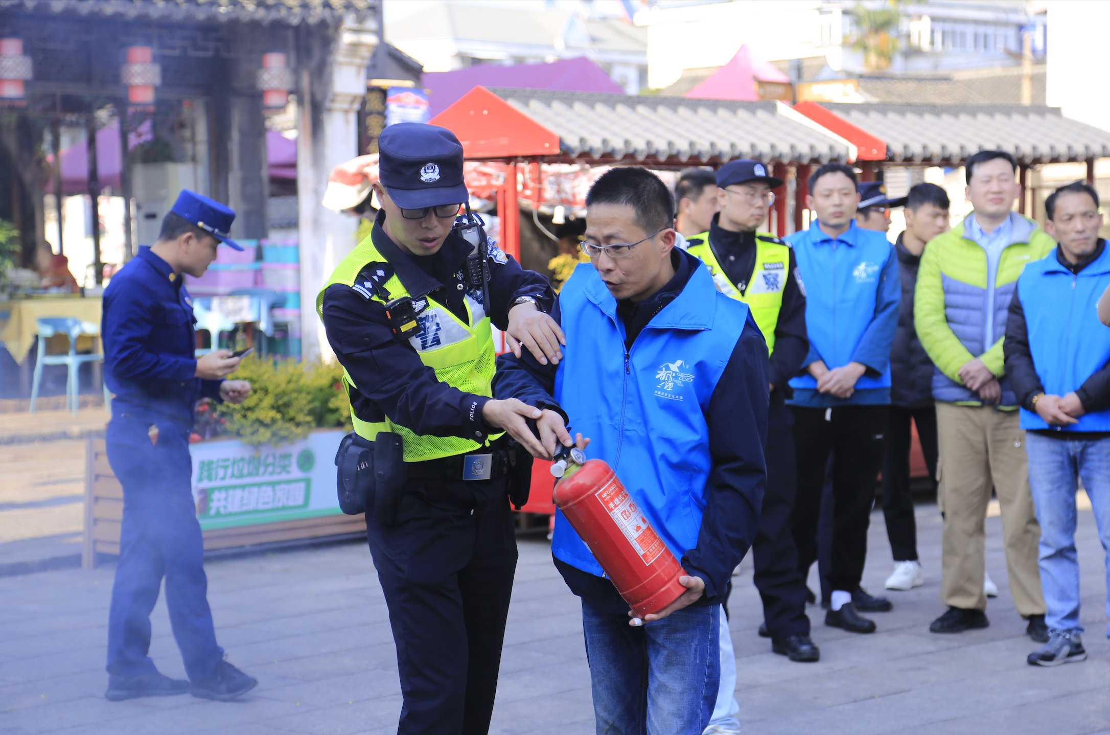 公安指導(dǎo)商戶們進(jìn)行消防演練