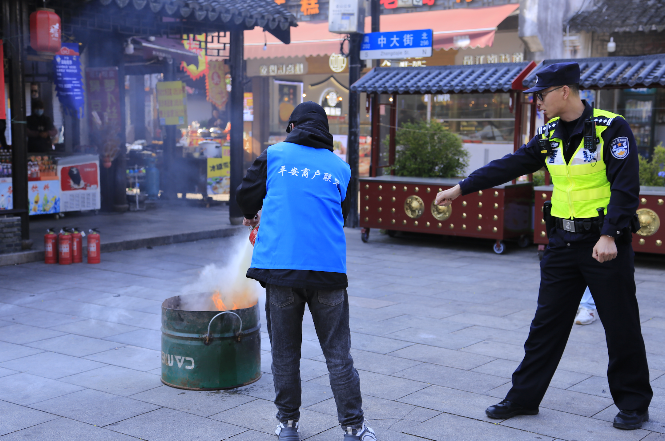 公安指導(dǎo)商戶們進(jìn)行應(yīng)急處突演練