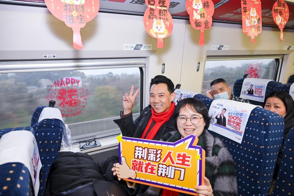 喜慶春聯(lián)、福字窗花、吉祥燈籠……2月7日,布置一新的G1136次列車,載著800多名在外務(wù)工的湖北荊門人從廣州啟程,一路歡聲笑語中,奔赴他們闊別已久的家鄉(xiāng)。