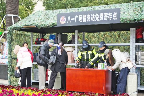 八一廣場(chǎng)是南昌核心地標(biāo)、網(wǎng)紅打卡地。中午12時(shí)許,記者來到八一廣場(chǎng),只見廣場(chǎng)上空紅旗迎風(fēng)招展,現(xiàn)場(chǎng)人流如織。廣場(chǎng)東側(cè)設(shè)置的一處“警務(wù)站免費(fèi)寄存點(diǎn)”格外醒目,里面放滿大大小小的箱包。