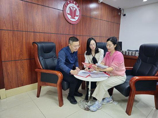 圖為周秋妤(右一)和同事一起對疑難復雜案件進行合議,研究實質(zhì)化解行政爭議路徑。廣州市司法局供圖