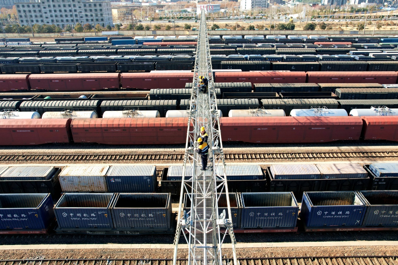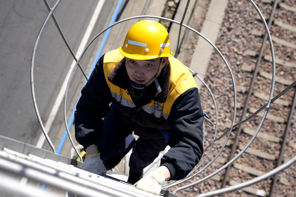圖為鄭州供電段職工攀登上6米高梯車,檢修鄭州站接觸網(wǎng)設(shè)備。