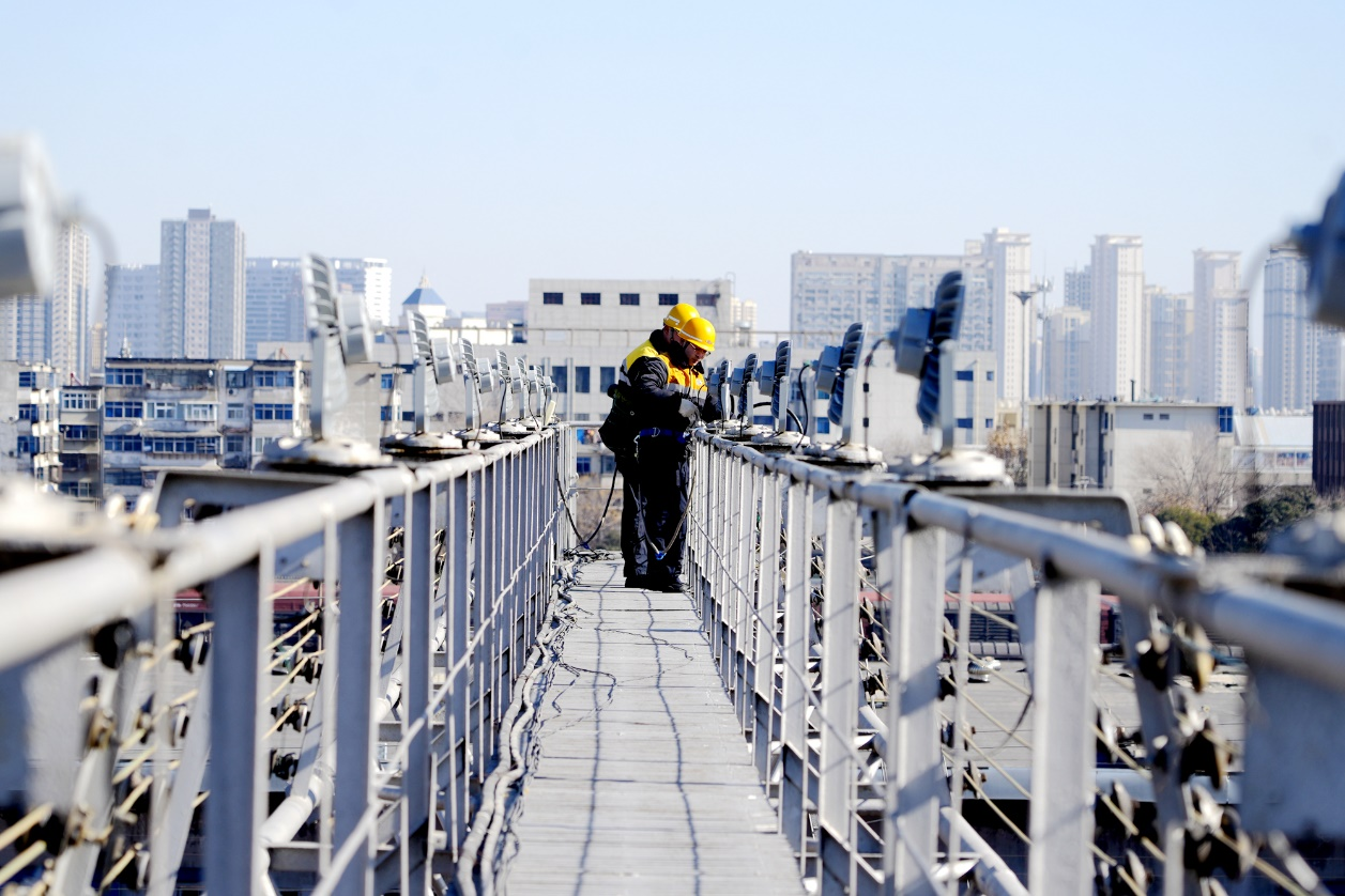 圖為鄭州供電段職工在燈橋上檢修投光燈。