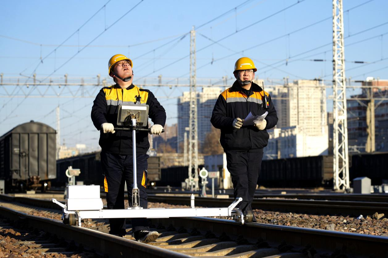 圖為鄭州供電段職工利用接觸網(wǎng)幾何參數(shù)智能檢測裝置對接觸網(wǎng)設(shè)備進(jìn)行測量。