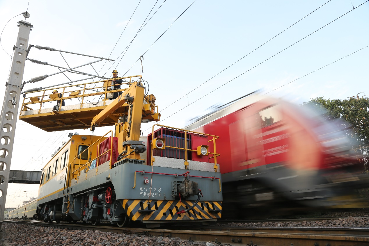 圖為鄭州供電段職工操作作業(yè)車對接觸網(wǎng)開展全面檢查。