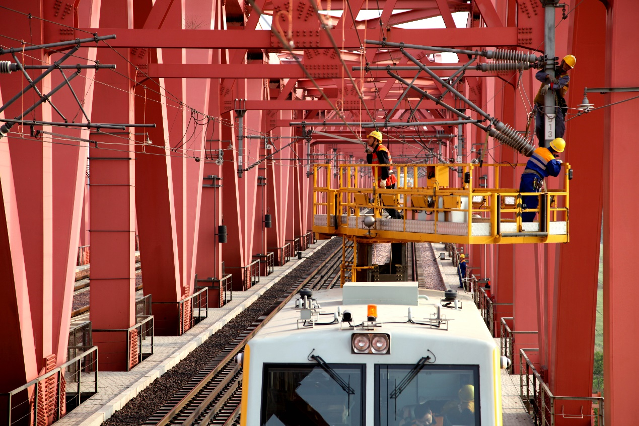 圖為鄭州供電段職工在京廣線黃河大橋上對接觸網(wǎng)設(shè)備進(jìn)行檢查。