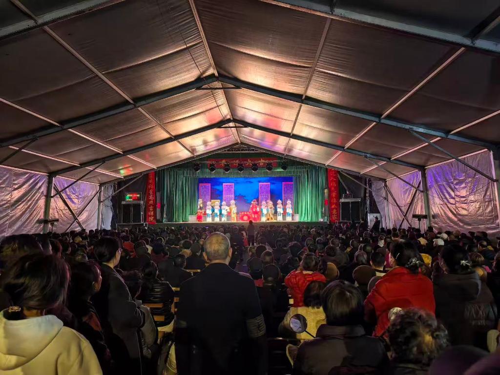 圖為2月21日晚上浙江省義烏市王高畈村的婺劇演出現場。(受訪者供圖)