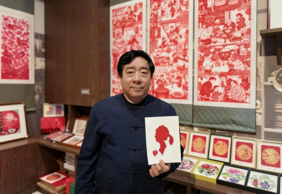 工坊中央,克樹利被層層觀眾圍住,叫好聲此起彼伏。只見他手持一張巴掌大的紅紙,目光在人群中一掃,隨手拉住前排一位扎馬尾辮的小姑娘,手上的剪刀便如游龍般翻飛起來。不畫底稿、不做標(biāo)記,紅紙?jiān)谒种行D(zhuǎn)變形,幾十秒的工夫,一把剪刀開合之間,一張惟妙惟肖的人影剪紙便已成型——俏皮的馬尾辮、抿著嘴的笑臉,甚至連小姑娘頭頂上的發(fā)卡都清晰可見?!跋瘢√窳?!”圍觀人群中爆發(fā)出一陣熱烈的掌聲,小姑娘捧著剪紙,喜笑顏開。