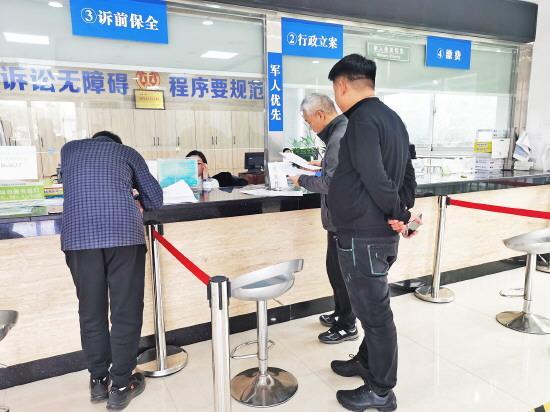 圖為河南省平頂山市衛(wèi)東法院立案庭庭長(zhǎng)張小磊(右二)在訴訟服務(wù)窗口審核訴前財(cái)產(chǎn)保全申請(qǐng)材料。