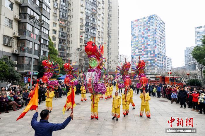 2月27日,湖北武漢,國家級非遺漢陽高龍走進社區(qū)進行表演,以傳統(tǒng)民俗為居民送上馬年元宵祝福。圖為高龍表演吸引民眾觀看。中新社記者 張暢 攝