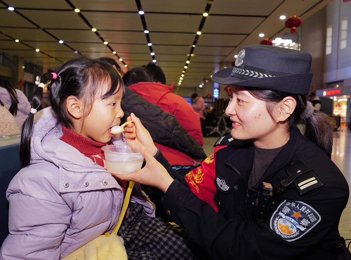 3月2日,湖北省宜昌東站迎來了春運返程客流高峰。武漢鐵路公安局襄陽公安處宜昌東站派出所民警將湯圓送到候車室,與旅客共慶元宵佳節(jié),并開展法治宣傳。