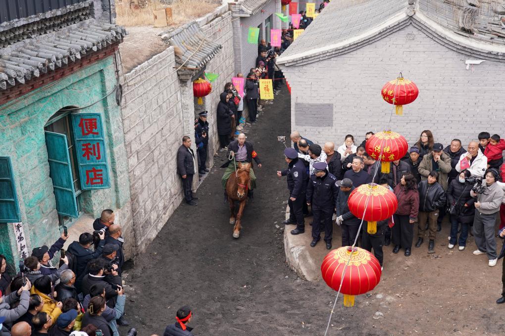 3月4日,農歷正月十六,這個距離娘子關僅6公里的小山村,迎來了一年中最熱鬧的時刻,村中那條長約400米、寬不足4米的青石古巷上,里三層外三層擠滿了人。沿路民房的臺階上、門檻上,甚至屋頂上,都早已站上了不請自來的看客,主人家卻也毫不在意:“今天這個大日子,大家一起熱鬧熱鬧!”