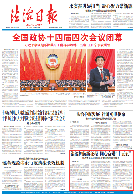2026年全國(guó)兩會(huì)為“十五五”時(shí)期高質(zhì)量發(fā)展擘畫宏偉藍(lán)圖。作為全面依法治國(guó)的重要力量,律師行業(yè)積極融入國(guó)家發(fā)展戰(zhàn)略,從法治專業(yè)視角建言獻(xiàn)策,為“十五五”藍(lán)圖貢獻(xiàn)智慧與思考。近日,《法治日?qǐng)?bào)》記者圍繞新時(shí)代律師的使命定位、服務(wù)國(guó)家戰(zhàn)略的著力點(diǎn)等話題,對(duì)部分來自律師行業(yè)的全國(guó)人大代表和全國(guó)政協(xié)委員進(jìn)行了采訪。