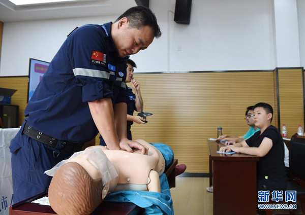 7月15日,在合肥市常青街道姚公社區(qū),合肥市水上應(yīng)急救援隊(duì)隊(duì)員用模型為孩子們介紹溺水后自救互救知識(shí)。