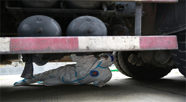 移民管理警察正在檢查車輛底盤(pán)。(肖富貴 攝)