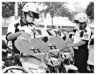 高考在即,河北省滄州市交警提前部署高考護(hù)考管控措施,為接送考生車輛“護(hù)航”。圖為滄州市公安交警支隊(duì)二大隊(duì)鐵騎交警為警用摩托車粘貼“愛心護(hù)考”標(biāo)識(shí)牌。
