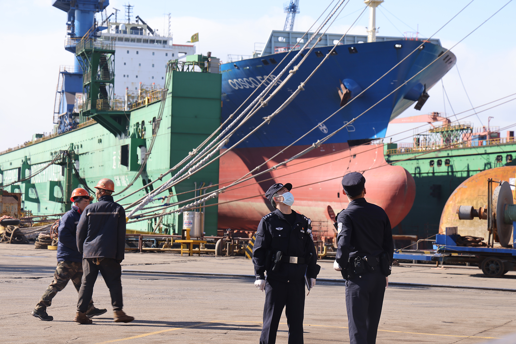 近日,遼寧大連出入境邊防檢查站出臺服務(wù)海港口岸高質(zhì)量發(fā)展十一項措施提升通關(guān)便利化水平,內(nèi)容包括創(chuàng)新實現(xiàn)邊檢通關(guān)進度“一鍵直推”、開通“邊檢即時通”平臺、保障特定類型船舶“特辦快辦”等。圖為11月14日,民警走訪造船企業(yè)。