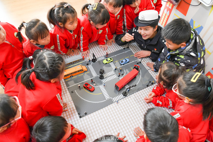 近日,安徽省含山縣公安局交管大隊(duì)組織民警走進(jìn)幼兒園開展以“小手拉大手 安全文明出行”為主題的交通安全宣傳活動(dòng),增強(qiáng)幼兒道路交通安全意識(shí)。圖為民警通過(guò)模擬道具與孩子們互動(dòng)交流。