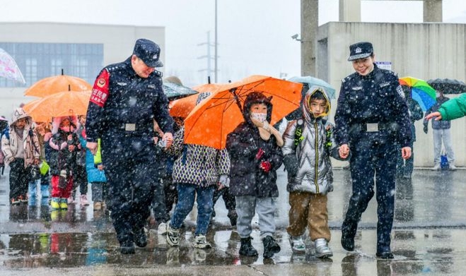 安徽馬鞍山市和縣公安局護學崗民警雪中護送學生放學