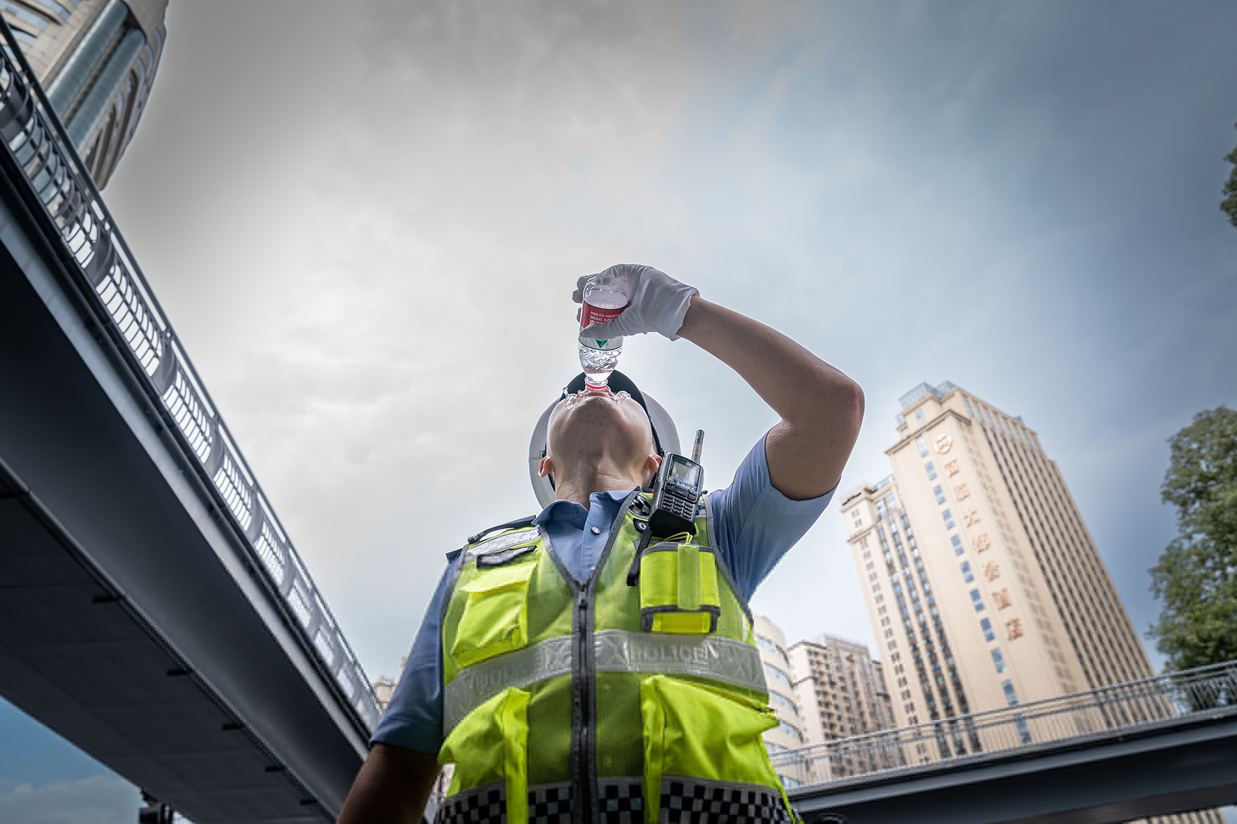 8月8日,四川省綿陽(yáng)市出現(xiàn)34℃高溫天氣。綿陽(yáng)市公安局交警直屬一大隊(duì)民警堅(jiān)守路面,冒高溫指揮疏導(dǎo)交通,確保道路安全暢通。
