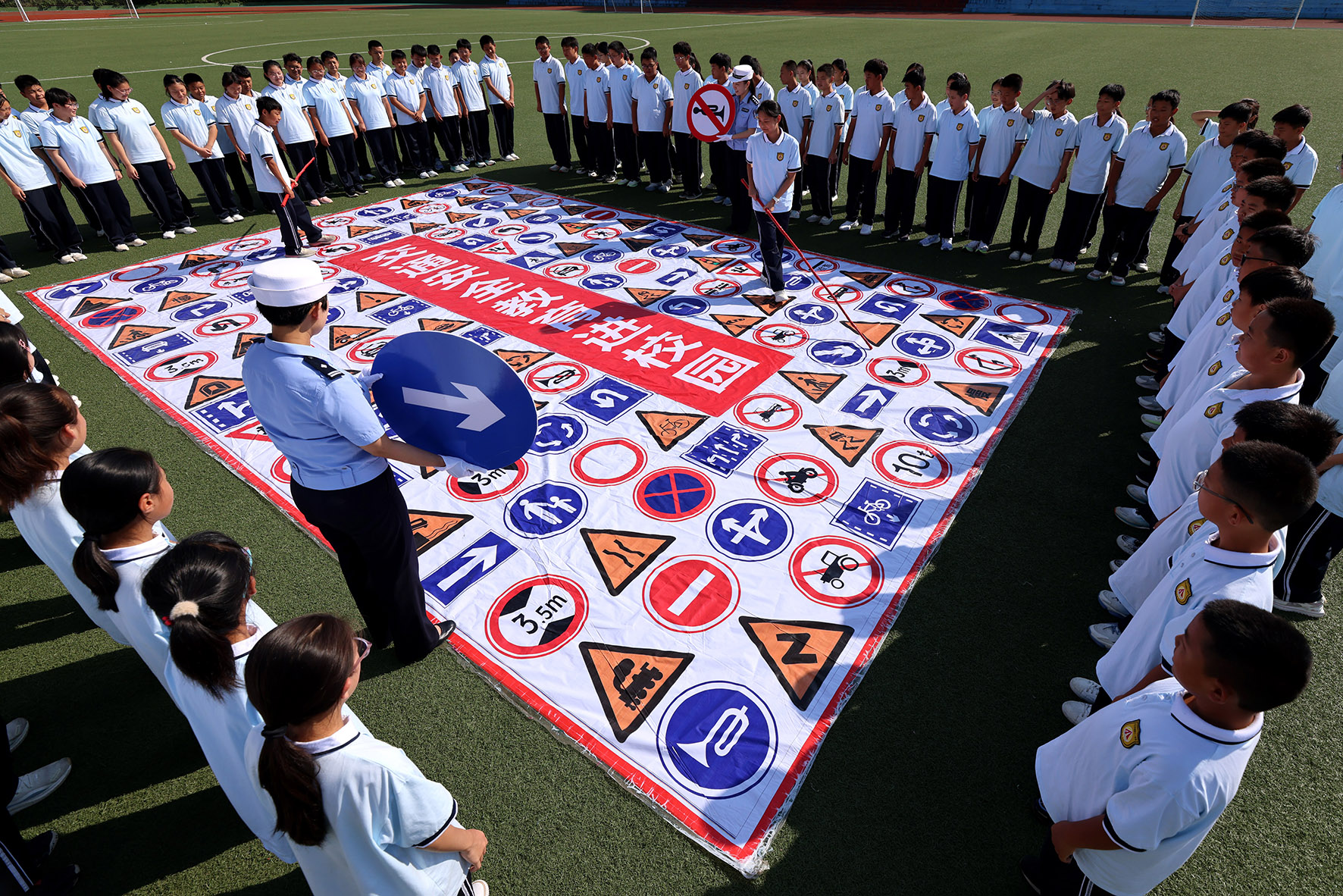 9月14日,在山東省棗莊市第四十一中學(xué),民警和學(xué)生們一起玩“尋找道路交通標(biāo)志”趣味游戲。新學(xué)期伊始,棗莊市公安局市中分局交通警察大隊組織民警走進(jìn)校園開展豐富多彩的安全教育活動,提升學(xué)生們交通安全法規(guī)意識和防范意識。