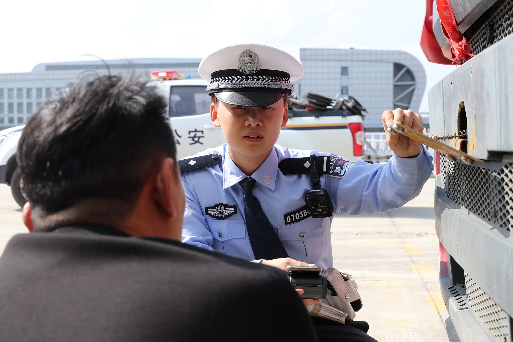 圖為民警正在查處一起涉牌違法行為。